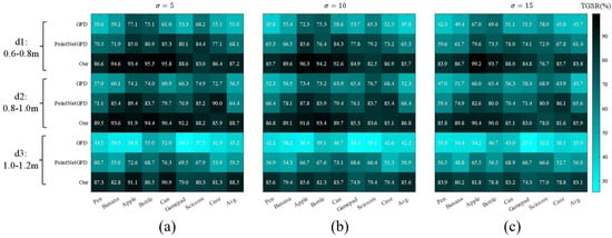 Each group was repeated 1000 times in the simulation. A successful grasp required lifting the target over 20 cm with 4 m/s² acceleration. TGSR was calculated and compared to learning-based methods GPD [19] and PointNetGPD [20]. The experimental results are shown in Figure 9, where (a), (b), and (c) represent the TGSR (%) results under point cloud noise levels of = 5 mm, = 10 mm, and = 15 mm, respectively. The results indicate that for medium-distance targets (0.8–1.0 m), PointNetGPD and the proposed method both achieved TGSRs above 70% in low noise, with the proposed method reaching over 83%. Under high noise, GPD and PointNetGPD rates dropped by 15.3% and 8.5%, respectively, due to reliance on point cloud stability. The proposed method showed only a 4.9% reduction, demonstrating greater robustness.