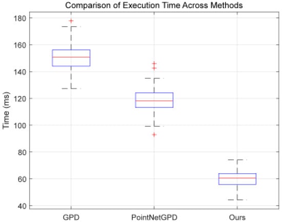 Box Plot comparing grasp pose estimation time for three methods. (The boxplot illustrates the distribution of the data, where the blue box represents the interquartile range (IQR) with the lower edge at the first quartile (Q1), the upper edge at the third quartile (Q3), and the middle line representing the median (Q2). The red line indicates the mean value of the data, while the red cross marks the outliers, which are data points significantly different from the majority of the data, typically located beyond 1.5 times the IQR from the quartiles.)