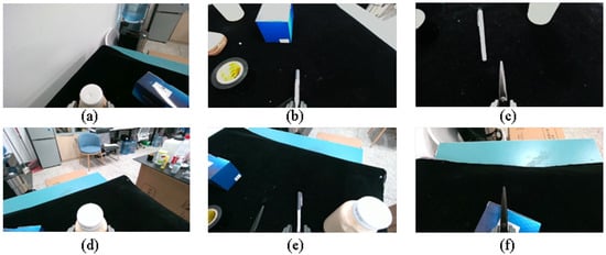 Example of target grasp execution, with images captured by Realsense D455 Color Camera, with the gripper end at the bottom of the image. (Figure (a): Grasping the bottle on the left side of the robot; Figure (b): Grasping the pen; Figure (c): Grasping the scissors; Figure (d): Grasping the bottle on the right side of the robot; Figure (e): Grasping the pen placed directly next to the bottle; Figure (f): Grasping the scissors on the box.)