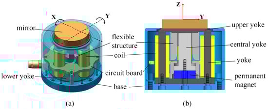 The proposed HRAFSM mainly consisted of a mirror, an upper yoke, a flexible structure, a central yoke, a permanent magnet, two sets of orthogonal electromagnetic drive units, a lower yoke, a circuit board, and a base (Figure 1). The mirror was fixed on the upper yoke, which was, in turn, fixedly connected to the flexible structure with bolts. The lower yoke, with a groove at the center for fixing the permanent magnet, was placed between the flexure hinge connected to the base via a through-hole at the bolt’s passing position. The central yoke was located above the permanent magnet, fixed to the base with bolts. This setup allowed an air gap between the central and upper yokes. Four orthogonal through-holes were drilled on the outer ring of the lower yoke for installing the electromagnetic drive unit. The circuit board used for processing strain signals was integrated into the structure.