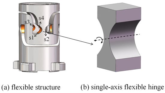 The flexible structure consisted of four single-axis parabolic flexure hinges, as shown in Figure 2b. These flexure hinges were first connected in parallel and then in series to form a decoupled guiding mechanism with two degrees of freedom (DoF). To obtain the integrated design of the driving and sensing mechanism, two strain gauges were attached to each of the four flexure hinges as sensors. We designed two sets of Wheatstone bridge strain sensors to measure the two rotational DoF. The location of one set of strain gauges is shown in Figure 2a. Strain gauges s1 and s2 were attached to both sides of one flexure hinge, and s3 and s4 were attached to both sides of another flexure hinge.