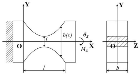 As a guiding component for the mechanism’s rotation and an adhesive structure for the strain gauge, flexible hinges required a detailed design. According to the strain gauge sensing method, it was necessary to obtain the maximum stress at the minimum cutting thickness of the single-axis flexible hinge’s surface, so a single-axis parabolic flexible hinge was selected as shown in Figure 3; is the minimum cutting thickness for the flexible hinge, is the length of the parabolic section, is the cutting thickness for the flexible hinge, and is the thickness of the flexible hinge section.