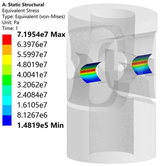 According to the designed 1.5 mrad rotation angle, the stress of the flexible hinge was analyzed using ANSYS Workbench 2021 R1, as shown in Figure 4. It can be seen that the maximum stress at the flexible hinge was 71.95 MPa, which is consistent with the theoretical analysis and less than the yield strength of the material.