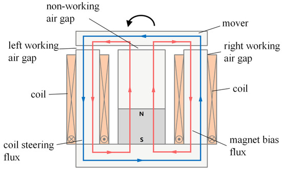 The bias flux generated by the permanent magnet (red arrow in Figure 5) passes through the central yoke, the non-working air gap, the upper yoke/mover, the left and right working air gaps, and the left and right yoke, and finally returns to the permanent magnet through the lower yoke. When the upper yoke/mover is in a horizontal state, the magnet bias flux is evenly distributed in the left and right air gaps. Under no current, the forces on the left and right sides of the upper yoke are balanced, with no torque effect. The coil steering flux generated by the input current (blue arrow in Figure 5) passes through the left and right yokes, the upper yoke/mover, the left and right air gaps, and the lower yoke in a counterclockwise direction. The magnet bias and coil steering fluxes superimpose within the two working air gaps; in the left (right) working air gap; the two fluxes follow the same (opposite) directions (Figure 5), resulting in unequal magnetic induction intensities. This leads to unbalanced forces at the two ends of the upper yoke/mover, causing its rotation due to electromagnetic torque; the rotation direction changes with the direction of the current in the electromagnetic coil.