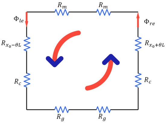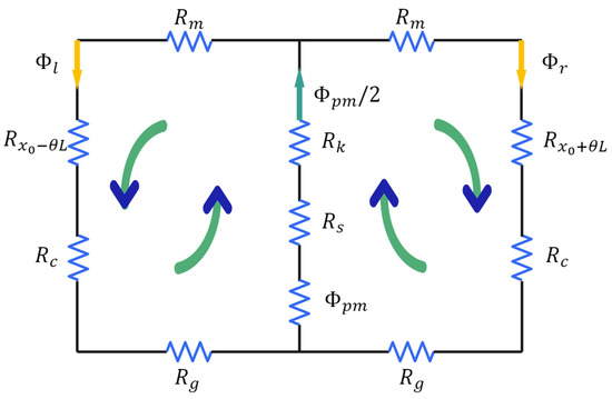 According to Kirchhoff’s first law, the magnetic fluxes in the left and right magnetic circuits must be equal in magnitude. Moreover, according to Kirchhoff’s second law of magnetic circuits, the magnetic potential of the left and right magnetic circuits can be expressed as