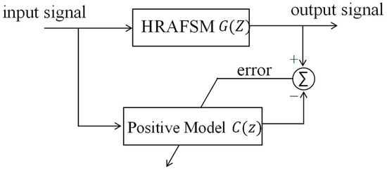 There are two types of adaptive inverse control, one is offline and the other is online [21], and the positive model and inverse model were determined to be offline in this research. The AIC construction process involved the building of a positive model based on the physical system (Figure 11) and an inverse model based on the positive model. In the positive model, the input signals were passed through an HRAFSM and a filter. The output angle of the HRAFSM was used as the expected signal, and the filter parameters were continuously adjusted on the basis of the difference signal between the filter output and the desired signal till the former became consistent with the real system’s output.