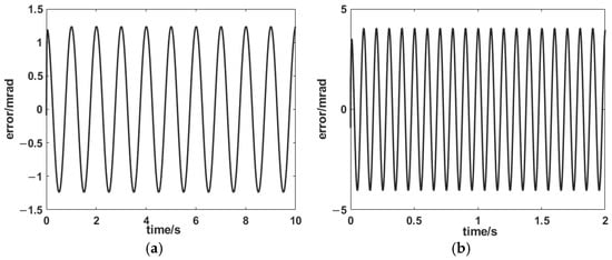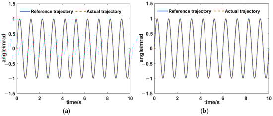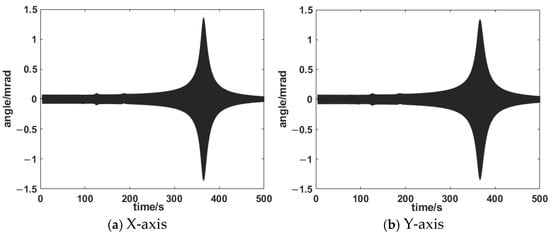 In order to verify the effectiveness of the controller through simulations, the transfer functions of the rotation angle around the x- and y-axes should be obtained by using the system identification method [22,23]. The time-domain response of the HRAFSM’s rotation angle around the x- and y-axes was obtained through frequency scanning. By using the system identification toolbox in Matlab/Simulink in combination with Equation (19), we obtained the transfer functions as