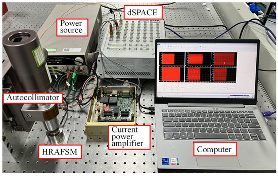 The HRAFSM experimental system included a computer, dSPACE, a current power amplifier, the HRAFSM, and an autocollimator (Figure 17). The HRAFSM employed strain sensing, which cannot directly provide the angle of rotation, and hence was calibrated using an autocollimator. The control algorithm was designed using Matlab/Simulink R2022b, and compiled and tested using the dSPACE ControlDesk 2020 for the control effects. Simultaneously, dSPACE achieved strain signal acquisition and voltage signal transmission. The self-developed current drive mainly converted voltage signals into current signals and subsequently drove the HRAFSM.