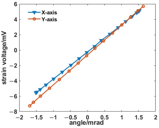 The proposed HRAFSM uses the strain sensors and first calibrates the relationship between the strain voltage and the rotation angle through the autocollimator within the total travel range, as shown in Figure 18. Testing results revealed a good linear relationship between the rotation angle of the two axes and their corresponding strain voltages. Therefore, this sensing method could be applied to the closed-loop feedback control of the HRAFSM. The sensitivities of the x- and y-axes were 3.526 mV/mrad and 3.886 mV/mrad, respectively, with both axes achieving an expected rotation angle of ±1.5 mrad.