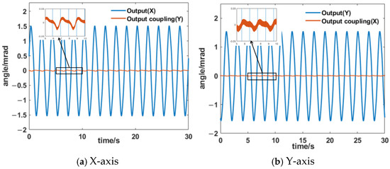 The two axes of the HRAFSM were structurally decoupled through flexible hinges. To evaluate the decoupling effect, sinusoidal excitation signals were applied to both axes separately and the coupling response was recorded (Figure 19). Under a sinusoidal rotation of 1.5 mrad, the coupling magnitudes of the two axes of the designed HRAFSM were 0.02 mrad and 0.015 mrad, respectively, with coupling degrees of approximately 1.3% and 1%. It indicated good decoupling characteristics.