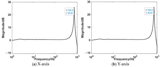 In order to obtain the dynamic characteristics of the HRAFSM, a sine sweep signal was used to sweep the mechanism, with a fixed amplitude of 0.1 V and a frequency range of 0.1 Hz to 1 kHz. The time-domain response and frequency-domain response are shown in Figure 20 and Figure 21. From the figure, it can be seen that the first-order natural frequencies of the x-axis and y-axis are 722.5 Hz and 724.7 Hz, respectively.