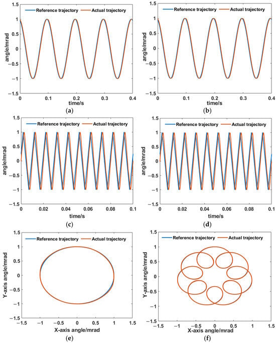 The HRAFSM’s tracking control for (a,b) the x- and y-axis sinusoidal trajectories, respectively; (c,d) x- and y-axis triangular trajectories, respectively; (e) a circular trajectory; and (f) a complex trajectory.