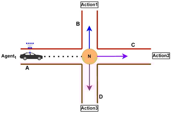 As an example, let us consider a single agent amongst the agents, denoted as in Figure 1. As progresses toward intersection N along the way to its destination, it encounters three potential routes. It must make a critical decision: continue straight through route C, turn left via route B, or head to the right using route D. The challenge arises from the need for the agent to intelligently evaluate traffic conditions along these routes, considering factors such as traffic volume, speed limits, road distance and other important characteristics. The goal is for the agent to make a real-time, informed decision that minimizes traffic congestion and optimizes its route for efficient travel to the destination.
