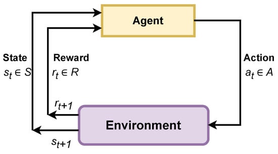 One of the prominent algorithms in RL is the Deep Q Network (DQN) []. It combines deep neural networks with Q-learning to learn the optimal policy for a given task. Q-learning is a method that uses a Q-table of state–action values, also called Q-values []. DQN replaces the Q-table with a deep neural network to represent the Q-function, which allows it to learn complex relationships between states and actions. DQN typically uses two neural networks: a main network and a target network. The main network is used to estimate the Q-values for the current state and action. It is a standard neural network that takes the current state as input and outputs the Q-values for all possible actions. The Q-values are then used to select the action with the highest expected reward, as denoted in Equation (2), where denotes the weight matrix of the main network, and is the feature vector representation of state s. While the target network is used to estimate the Q-values for the next state, it is a copy of the main network, and its weights are updated less frequently as denoted in Equation (3), where signifies the weight matrix of the target network and represents the feature vector representation of state :
