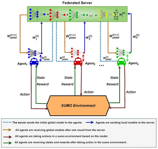 - Agents: Agents are SUMO-based intelligent vehicles equipped with a DQN model. They autonomously take actions based on dynamic road and traffic conditions (states). The role of agents is to train their DQN models and frequently send these model updates to the federated server.