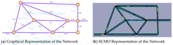 In Figure 4, we illustrate the graphical scenario (Figure 4a) alongside the corresponding network visualized within the SUMO simulator (Figure 4b). Our network consist of 15 edges, each with distinct properties such as speed limit and length. It is noteworthy that SUMO categorizes vehicles into two types. The first consists of randomly generated vehicles, following a specific probabilistic approach based on Origin–Destination (OD) points to simulate dynamic traffic congestion. These vehicles are marked as red and blue in Figure 4b, representing trucks and regular cars, respectively. The second group comprises agent vehicles operating within the environment with the purpose of learning and selecting optimal actions. These agent vehicles are represented as yellow in Figure 4b. To simulate real-time traffic conditions, agents start from various locations but share a common destination, denoted as in Figure 4a. Additionally, we utilize SUMO’s randomTrip.py feature to generate random traffic within the network, specified as , which indicates that the simulation will run for 3600 s, generating a random vehicle every 3 s until the simulation ends. The simulation involves a total of 1200 non-intelligent vehicles and 5 intelligent agents. This setup ensures realistic traffic conditions while providing a controlled environment for evaluating the performance of intelligent agents.