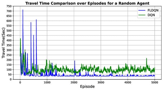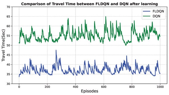 Results depicted in Figure 9 demonstrate that FLDQN outperforms DQN, with FLDQN achieving an average travel time of 33.6 s, compared to 51.4 s for DQN. This equates to a 34.6% reduction in travel time, calculated as in Equation (9):