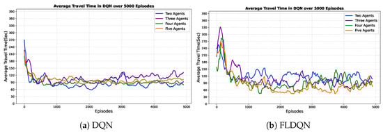This subsection explores how the number of agents influences the performance and dynamics of both DQN and FLDQN. For effective route navigation and optimal travel time, a comprehensive understanding of traffic dynamics is essential. To assess the impact of the number of agents on performance, we conduct experiments with varying agent counts. Our experiments assess the impact on travel time, crucial for effective route navigation. The results in Figure 6 and Figure 7 depict the average travel time over the episodes and number of agents, respectively. DQN agents over episodes, shown in Figure 6a, operate independently without influencing each other throughout the episodes. Clear fluctuations and independence are observed, with each agent running and learning autonomously. For instance, when the number of agents is 2, the average travel time is approximately 89 s, increasing to 111 s for 3 agents, decreasing to 93 s for 4 agents, and again increasing to 101 s for 5 agents over 5000 episodes, showcasing the fluctuation and independence of agents in DQN. Figure 6b emphasizes the results of our proposed FLDQN approach, highlighting agent cooperation and the significant impact of the number of agents on overall system performance. In FLDQN, the number of agents affects the overall system performance as depicted in Figure 6b; for instance, when the number of agents is set to 2, it takes 121 s for 5000 episodes, decreasing to an average of 110 s for 3 agents, 95 s for 4 agents, and 84 s for 5 agents to reach the destination. These values clearly demonstrate the trend of the minimization of the total average travel time in FLDQN and the dependency of the overall system on the number of agents.