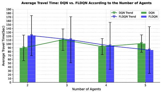 Comparison of average travel time between DQN and FLDQN by varying numbers of agents. Performance in the system is dependent on the number of agents.