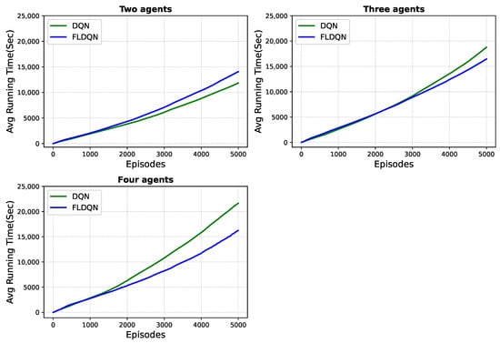 As depicted in Figure 8, FLDQN outperforms DQN in terms of total running time. In a two-agent setup, DQN requires 11,800 s to complete 5000 episodes, whereas FLDQN takes 14,000 s. When the number of agents is increased to three, DQN consumes 18,800 s, while FLDQN takes 16,400 s for 5000 episodes. With four agents, the running time of DQN is 21,600 s, whereas FLDQN takes only 16,200 s for 5000 episodes. This trend highlights that as the number of agents increases, FLDQN exhibits a decreasing average running time compared to DQN, where each agent runs independently. The efficiency gains can be attributed to the weight-sharing mechanism employed in FLDQN, where all agents utilize the weights of a single network learned during the training process. This approach reduces the learning time by minimizing the number of parameters that need to be learned as discussed previously. Our proposed approach assumes a common set of actions among agents while providing each agent with unique observations and hidden states. Furthermore, agents can be trained concurrently, thanks to the parameter-sharing scheme, which takes individual observations into account while leveraging the collective experiences of all agents. This feature clearly positions our suggested approach to lower computation costs and accelerate the training process.