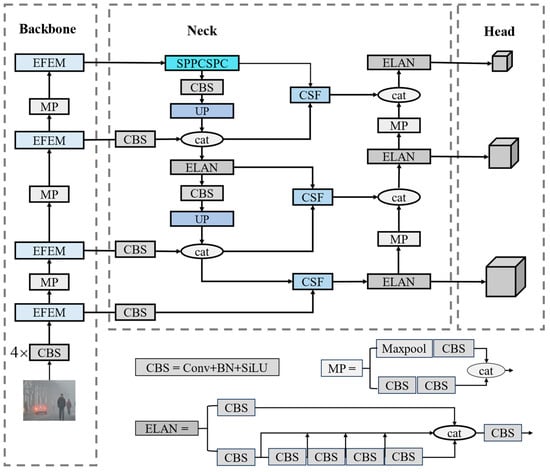 The vehicle and pedestrian images captured in adverse weather conditions reflects the following characteristics, including the blurred target edges, insufficient texture information, and significant scale changes. To deal with these issues, this paper proposes an Efficient Feature Extraction Module (EFEM). The EFEM is designed to improve the model’s adaptability to different scales and expand the receptive field for detecting targets [36]. This enhances the backbone network’s feature extraction capability for targets of various shapes and sizes.