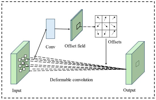 As shown in Figure 4, in DCNv2, deformable convolution introduces an offset to each sampling point in the convolutional kernel, allowing the kernel to take on arbitrary shapes. During training, the model learns both the offset and an associated weight for each sampling point, which determines the influence of that point on feature extraction. The computation for deformable convolution is expressed as follows: