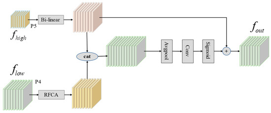 As shown in Figure 5, the CSF creates efficient connections between feature layers at different scales. This improves interaction between low-dimensional positional information and high-dimensional semantic information, enhancing feature fusion across dimensions. First, the CSF module uses the RFCA mechanism [42] to filter out noise and complex backgrounds in low-scale feature maps, while also expanding the receptive field. Then, to align the dimensions of high-level and low-scale features, bilinear interpolation is used to up- or down-sample high-level features. Finally, the filtered low-scale features are fused with high-scale features to boost the model’s feature representation capability. To enhance the feature pyramid network’s ability to capture accurate target location information, we add the P2 feature layer from the Backbone network. This addition provides the model with a more comprehensive set of feature information.