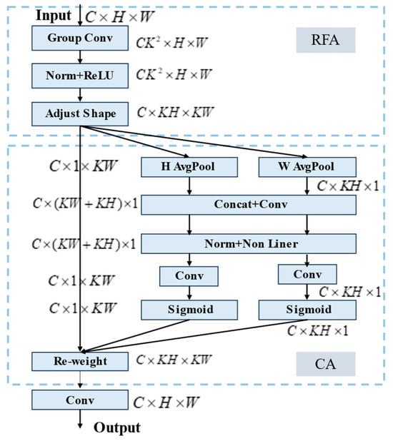Receptive-Field Coordinate Attention (RFCA) is a module that enhances the lightweight Coordinate Attention (CA) [43] with a receptive field attention mechanism. This mechanism directs attention to the spatial features within the receptive field, addressing the issue of parameter sharing in convolutional kernels. The RFCA module highlights the importance of various features within the receptive field. It also prioritizes spatial features to capture long-distance information, similar to the self-attention mechanism. This approach addresses the limitation of the CA mechanism, which only focuses on spatial features. It does this while keeping computational costs low. Additionally, it effectively solves the problem of convolutional parameter sharing, enhancing the model’s focus on contextually significant information. The improved RFCA mechanism, as shown in Figure 6, first uses grouped convolution to extract spatial features from the receptive field to reduce feature overlap. Next, the adjusted spatial features are passed into the CA mechanism. This enhances the model’s ability to focus on key information while minimizing interference from complex contextual information, ultimately improving detection performance.