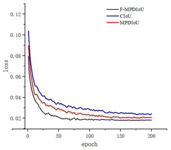 To verify the effectiveness of the F-MPDIoU loss function proposed in this paper, we trained models using CioU, MPDIoU, and F-MPDIoU. This training was conducted for 200 epochs on the DWAN under the same experimental conditions. A comparison of the visualized loss function results is shown in Figure 7. The figure shows that the improved F-MPDIoU loss function yields the best results. MPDIoU performs the second best, while the original CioU loss function from YOLOv7 performs the worst. Notably, the loss values for both F-MPDIoU and MPDIoU dropped below 0.03 after 50 epochs. In contrast, the CioU loss function did not reach this level until much later. This indicates that F-MPDIoU and MPDIoU enhance the model’s convergence speed and accuracy compared to CioU.