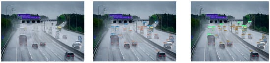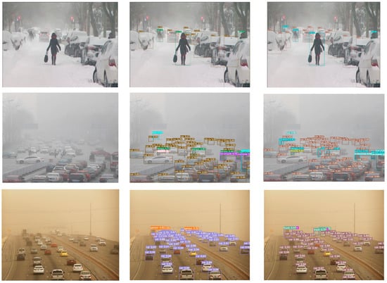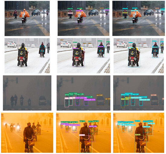 To further validate the effectiveness of the RFCS-YOLO algorithm proposed in this paper, we kept the experimental conditions and parameter settings consistent. We then compared our algorithm with other mainstream algorithms using the DWAN. The experimental results shown in Table 3 reveal that our algorithm achieves the highest mAP@0.5 of 86.5%. This represents a 4.2% improvement over the benchmark model, which is the YOLOv7 algorithm. Compared to the classical two-stage detection algorithm Faster R-CNN, our algorithm demonstrates significantly faster detection speed. Faster R-CNN is constrained by the sequential generation of candidate regions. It then follows up with classification, which slows down the overall process. Compared to the anchorless frame detection algorithm ConterNet [48], our algorithm performs better. Our algorithm can effectively handle overlapping targets of vehicles and pedestrians in the image. Compared to SSD, YOLOv5 [49], and YOLOv8 [50], our algorithm shows fewer cases of missed detections and misdetections. These three algorithms are mainstream one-stage target detection methods. Our algorithm is particularly effective at detecting multi-scale vehicles and pedestrians. Compared with the latest single-stage detection algorithms this year, namely YOLOv9, YOLOv10, and YOLOv11, the average detection accuracy of our model has been increased by 1.9%, 2.5%, and 1.1%, respectively. Although the frames per second (fps) is slightly lower than that of YOLOv10 and YOLOv11, the average detection accuracy of our model is higher than theirs. This is because these latest algorithms did not take into account the situation in complex weather environments such as haze, rain, and snow at the beginning of their design. In such environments, the collected images are blurry and there are occlusion problems for the detection targets. Regarding Real-Time Detection Transformer (RT-DETR) [51], its performance is hindered by interference under adverse weather conditions, making its detection less effective compared to our algorithm. Compared with the DETR algorithm [52], due to the complexity of the transformer architecture itself, its computational complexity will result in a slower detection speed, making it unsuitable for real-time target detection.