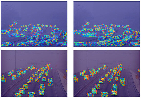 To visually observe the features learned by the trained network, we conducted a heatmap analysis on both the baseline model YOLOv7 and the RFCS-YOLO model. The results are shown in Figure 10. The first column displays the heatmaps from the baseline model, while the second column shows the heatmaps from the RFCS-YOLO model. From the figure, we can see that in dense scenes with occluded targets under adverse weather conditions, the baseline model exhibits insufficient feature learning. In contrast, RFCS-YOLO learns more detailed texture features of the targets and allocates more attention to them.