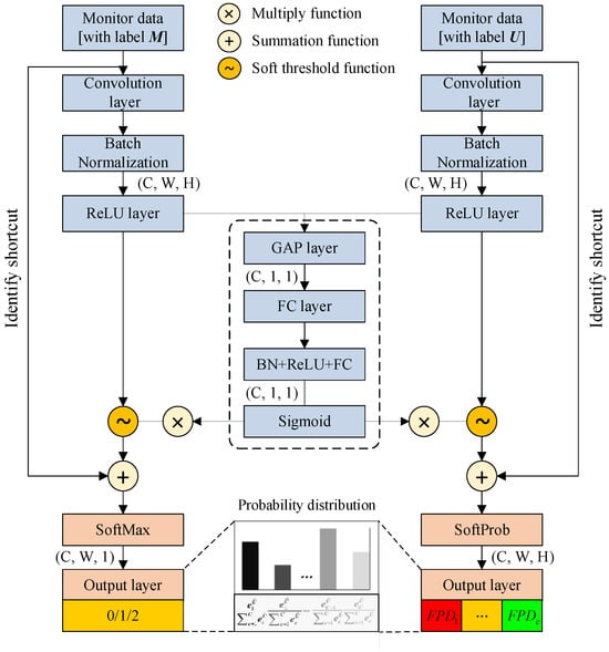 The purpose of this network is to calculate the fault probability distribution and determine the fault pattern. Similarly, the original signals are denoised by the MSQC. The denoised signals with corresponding fault category labels  are input into Locator-DRSN, and the soft threshold function is added to eliminate the noise-relative components. The fault probability distribution is output from the fully connected layer of the Locator-DRSN as