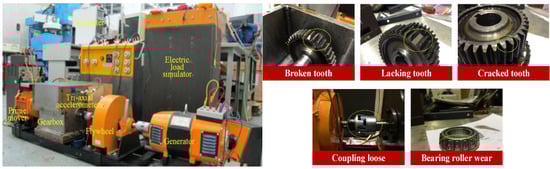To verify the proposed diagnosis method, the self-built wind turbine gearbox compound fault test platform was adopted to place the sample under single and compound fault patterns []. This is composed of a multistage gearbox, a generator motor, a prime mover, an electric load simulator, a data collection device, and a laptop, as shown in Figure 5. The rotational speed of a prime mover is 1400 RPM, and two meshing gearsets rotate at 1184 and 840 RPM. One health condition (H1), five single fault patterns (SFP1-SFP5) and six compound fault patterns (CFP1-CFP6) are simulated as exhibited in Figure 5 and Table 1. The fault units are processed artificially. For instance, the broken tooth is manufactured by the laser cutting method to cut a part of a gear tooth.