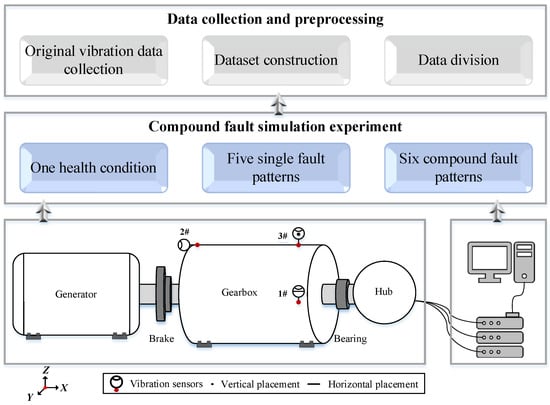 The raw vibration signal was acquired by use of the triaxial accelerometer (Type, NI-cDaq-9174; sensitivity, 100 mV/g). Each sample consisted of 2048 sampling points (2 s × 1024 Hz). There were 1500 samples under each fault pattern, and they were divided into 70%, 10% and 20% for the model training, validation and testing, respectively. The proposed algorithm was executed with MATLAB R2022b and Python v3.8, and conducted on a personal laptop with Intel Core i7 Processor 14900HK CPU, 32 GB memory, and a Microsoft Windows 11 enterprise operation system. The overall schematic of the experimental study design can be seen in Figure 6.