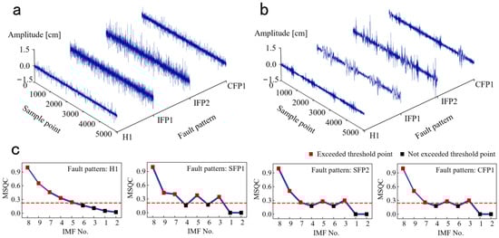 The denoised results of raw vibration signals under H1, SFP1, SFP2, and CFP1 are shown in Figure 7. In Figure 7a,b, the amplitudes of vibration signals under SFP1, SFP2, and CFP1 are obviously larger than that under H1. This phenomenon helps us to identify different fault patterns from aspects of time-domain discrepancy. In Figure 7c, the MSQCs of each IMF component under four fault patterns are exhibited. When the MSQC threshold is 0.25, the denoised signals are obtained by reconstructing the effective IMF components exceeding the MSQC threshold. This indicates that the no. 3, no. 5, and no. 7–9 IMFs are reserved under SFP1, SFP2, and CFP1, but the no. 3 IMF is eliminated, and no. 4 IMF is reserved under H1.