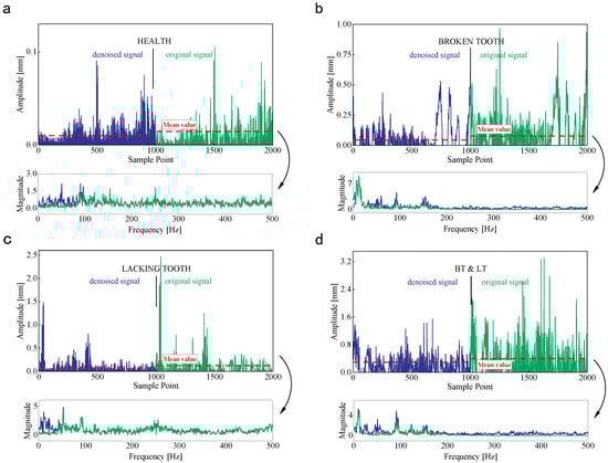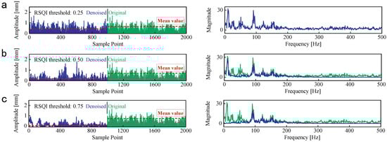 To achieve the optimal denoised effect, the denoised results of CFP1 with MSQC threshold = 0.25, 0.50, and 0.75 are exhibited in Figure 8. The waveforms of raw vibration and denoised signals show no obvious differences, and the frequency components are also similar. The influence of irrelevant noise components cannot be eliminated with the lower MSQC threshold. On the contrary, only 80–200 Hz frequency components are left, and the amplitude of denoised signals decreases significantly. The higher MSQC threshold eliminates the plentiful frequency components relevant to the wind turbine operation condition, and it will bring about a negative impact on the fault identification. Therefore, an appropriate threshold is critical for the denoised performance, and it is set to 0.5 through the repeated experimentation and signal analyses, as shown in Figure 8b.