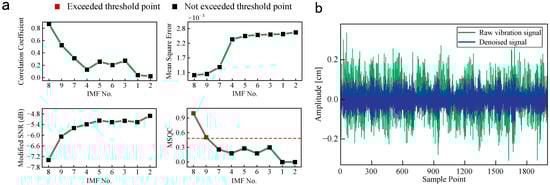 The denoised algorithm is used to process the raw vibration signals under CFP1, as shown in Figure 9. The MSQCs of no. 3, no. 5, and no. 7–9 IMFs exceed the threshold due to the lower mean square error, modified signal-to-noise, and larger correlation coefficient, as exhibited in Figure 9a. The reserved IMFs have plentiful wind turbine operation status information, and they are integrated to obtain the denoised signals. In Figure 9b, the waveforms of denoised signals present obvious periodicity, and their amplitude fluctuation is more subtle than that of the raw vibration signal.