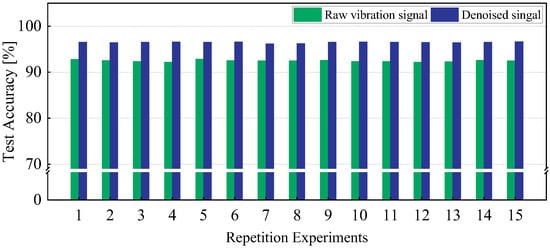 The repetition experiments were conducted to evaluate the performance stability of the compound fault diagnosis method. In Figure 11, the diagnosis accuracies of 15 repetition experiments are recorded. The overall fault diagnosis accuracies for the test sets are steady, and the mean value is up to 96.16%. Compared with the model training approach using raw vibration signals, the mean value of diagnosis accuracy increases by 4.71% (from 91.45% to 96.16%). This indicates that the denoised algorithm can eliminate irrelevant noise interference and improve diagnostic performance effectively.