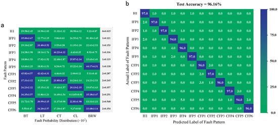 The diagnosis results after 15 repetition experiments are shown in Figure 12. In Figure 12a, the average fault probability distribution and fault number are recorded. The predicted fault numbers show larger fluctuation under IFP3 and CFP5. Their test accuracies are relatively lower. However, the propose compound diagnosis method can still identify fault patterns precisely, as exhibited in Figure 12b, and only some of the test samples are misjudged, which were identified as BT/CT under IFP3 and CL/CT under CFP5.