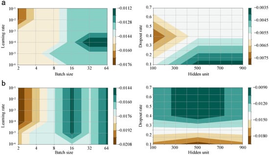 In Figure 13, the relation between the parameter group and the testing loss is exhibited for the last trial. In detail, the candidates of batch size, learning rate, dropout rate, and hidden unit are [2, 4, 8, 16, 32, 64], [1 × 10−6, 1 × 10−5, 1 × 10−4, 1 × 10−3, 1 × 10−2, 1 × 10−1], [0.1, 0.2, 0.3, 0.4, 0.5, 0.6, 0.7], and [100, 200, 300, 400, 500, 600, 700, 800, 900]. The optimal batch size, learning rate, dropout rate, and hidden unit of Counter-DRSN are 64, 1 × 10−4, 0.1, and 900. Those of the Locator-DRSN are 64, 1 × 10−4, 0.4, and 500.