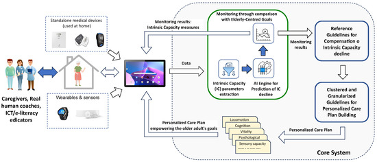 Processing of the collected data consists of extracting IC parameters describing user performance in particular IC domains, predicting IC degradation, and comparing the results with goals defined by the user. IC evaluation results and goals are the basis for the development of a personalized care plan. The care planning process is focused on the needs, values, and preferences of older individuals. The “Reference Guidelines for Compensation of Intrinsic Capacity decline” represent the gold-standard guidelines established by authoritative bodies, e.g., the World Health Organization, to compensate for the degradation in the intrinsic capacity that is programmed into a computer-interpretable version. The “Clustered and Granularized Guidelines for Personalized Care Plan building” were established by a working group of experts at the start of the project to cluster and granularize the “Reference Guidelines” into more refined guidelines according to a cluster of persons that share the same phenotypes for the degradation of their intrinsic capacities. They issue individualized guidelines and recommendations according to the empowered central goals of individuals. They allow the platform to build a personalized care plan to be communicated to the primary user for implementation.