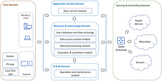 The platform architecture (Figure 2) follows the ISO/IEC CD 30141 standard [43]. The view presents the main physical system components (e.g., sub-systems, devices, networks, and software modules) of the platform, their distribution, and the topology of their interconnectivity. The devices are grouped into five domains. The user and sensing and controlling domains include devices installed at the user’s home and worn by the user. The other domains comprise software modules running on the core server located in the cloud environment.