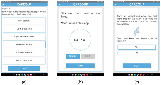 The Positive Health application: (a) Positive Health questionnaire; (b) locomotion chair stand screen; (c) locomotion balance test screen.