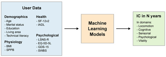 Besides assessment, such platforms may use predictive modules to provide users with information on possible risks and guide them to prevent, or at least delay, the occurrence of illness [30]. Several machine learning-based models for the prediction of elderly users’ health states over a longer time horizon have been proposed in the literature. Such models target all domains, from cognitive functions [31,32] and common comorbidities like diabetes [33] and balance problems [34] to specialized models aimed at specific diseases like renal failure [35].
