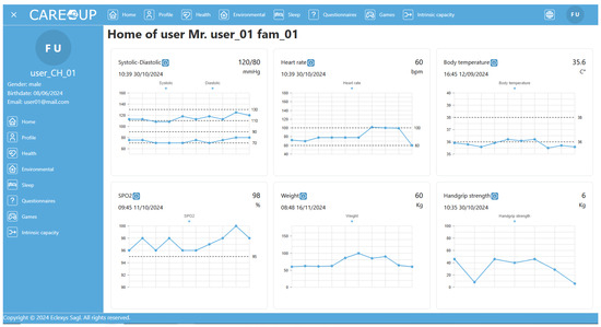 The CAREUP platform is an ICT-based monitoring solution aiming to mitigate the decline of older individuals’ intrinsic capacity. The idea of the platform’s operation is shown in Figure 1. The tablet installed at the user’s home performs two primary roles: it provides access to the platform services (e.g., reviewing monitoring results, playing games offered by the platform, and answering questionnaires) and is a gateway transferring results from wearables, medical devices, and sensors used by the person to the core system.