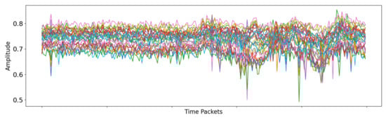 CSI is a critical parameter in wireless communication systems used to describe the characteristics of the channel. Unlike RSSI, CSI provides richer channel information, including the amplitude and phase of each subcarrier, frequency domain characteristics, spatial correlation, and more [24]. Through CSI, the receiver can gain a more accurate understanding of the channel state, thereby optimizing signal processing, improving communication quality, and enabling advanced applications. Figure 2 shows the waveform of a single-antenna carrier after processing the CSI information.