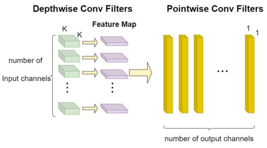 In the depthwise convolution, the operation is applied to each input channel independently without mixing information across channels. For an input tensor with dimensions [H, W, Cin], where H and W are the height and width and Cin is the number of input channels, using a k × k filter size, the output after depthwise convolution will have dimensions [H′, W′, Cin], with H′ and W′ depending on the kernel size, stride, and padding. The formula for depthwise convolution is as follows: