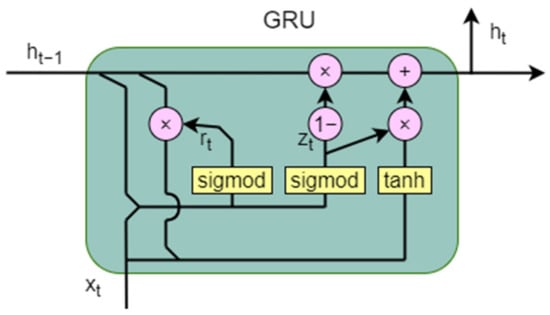 GRUs simplify the LSTM architecture by merging the cell state and hidden state into a single hidden state and reducing the number of gates from three (input, forget, and output gates in LSTM) to two (reset and update gates). The architecture of the GRU model is shown in Figure 6. Considering the computational capabilities of the device and time efficiency, this paper chose GRU over LSTM as the model architecture.