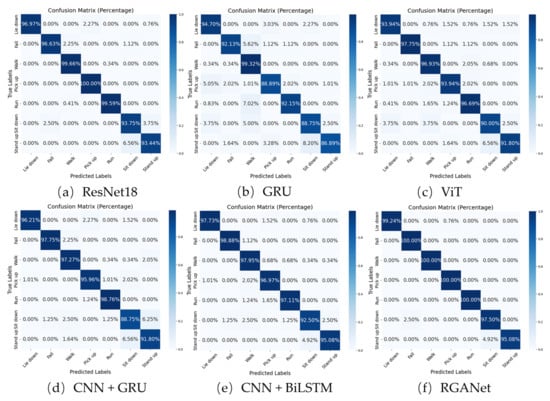 The models performed very well on both datasets, especially on the UT-HAR dataset, which demonstrated extremely high stability and accuracy. In contrast, while the NTU-Fi HAR dataset’s average performance was slightly lower than that of UT-HAR, it still reached a high standard and achieved nearly perfect classification results in some folds. However, NTU-Fi HAR exhibited greater performance variability. In summary, RGANet demonstrates outstanding performance across all evaluation metrics, indicating high accuracy and excellent classification performance. It also exhibits a certain level of stability and adaptability to different data distributions. These results suggest that RGANet is likely to be a highly effective classification algorithm suitable for applications requiring precision and reliability. However, it is important to note that these results were obtained under specific datasets and conditions. Therefore, when applying it to other data or scenarios, further validation of its performance may be necessary.