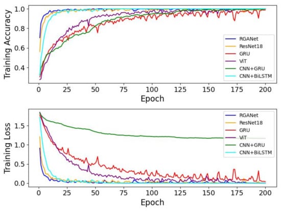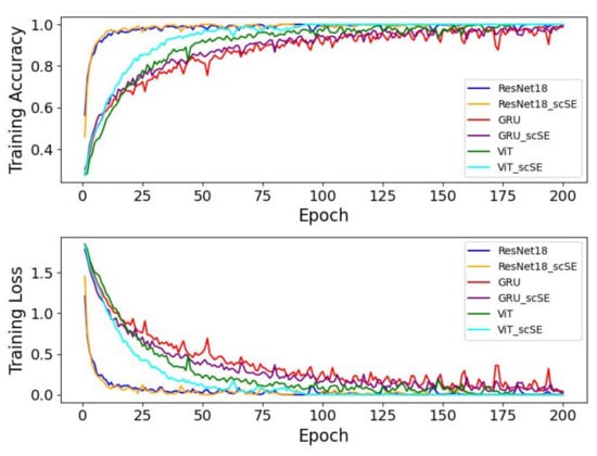 To validate the effect of the scSE block, we integrated it into the ResNet18, GRU, and VIT models. Figure 9 presents a comparative analysis of the training performance between the original models and their versions augmented with the scSE block.